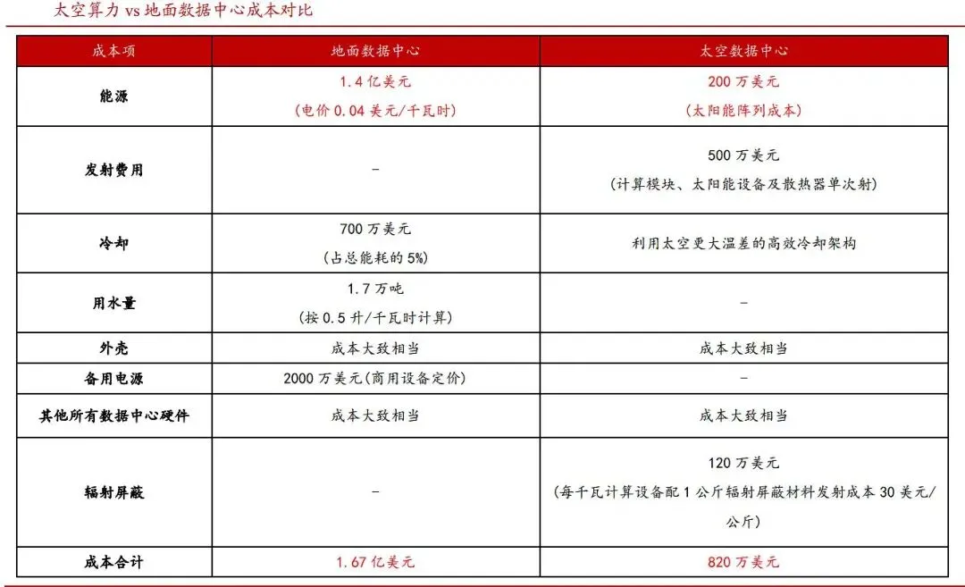 1)成本:利用廉价的太空能源(全天候不间断高强度的光伏发电),可以显著降低运营成本。据Starcloud白皮书,假设在太空部署40MW数据中心(10年运行)总成本约820万美元,相比地面数据中心1.67亿美元,降低95%。