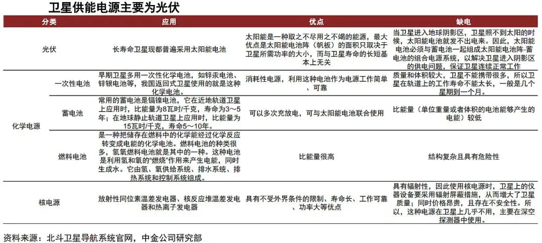 能源系统是低轨卫星平台的重要组成部分,据艾瑞咨询数据显示,卫星电源系统成本约占卫星平台总成本的22%。根据北斗卫星导航系统官方信息,目前卫星主要采用的电源包括太阳能电池电源、化学电源和核电源。其中,太阳能电池凭借其利用半导体材料光电效应将太阳能直接转换为电能的特性,可稳定工作数年至数十年,已成为长寿命卫星普遍采用的供能方式。
