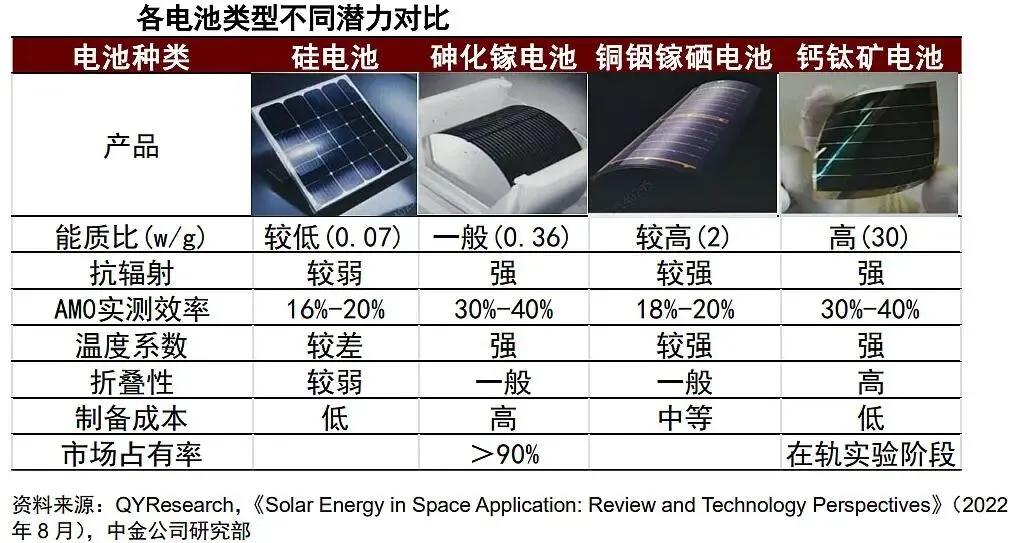 该路线被视为未来太空光伏的重要突破方向。其在实验室中已实现媲美甚至超越砷化镓电池的转换效率,兼具轻量化、柔性化与良好的抗辐照性能,高度契合航天应用需求。若能在长期环境稳定性与大面积量产工艺上取得突破,钙钛矿技术有望大幅降低太空光伏的硬件成本。