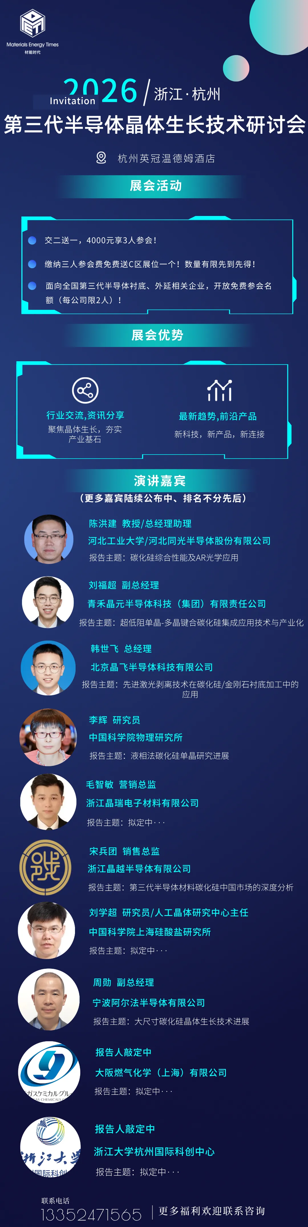 2026年3月16-18日,2026年第三届第三代半导体晶体生长技术研讨会将于杭州举行。本届会议由浙江大学杭州国际科创中心与材能时代联合主办,以“聚焦晶体生长,夯实产业基石”为宗旨,聚焦晶体生长、衬底及外延技术等关键议题,致力打造学术-技术-产业的高水平交流平台。诚邀全球业界同仁共聚杭州,共推产业发展。