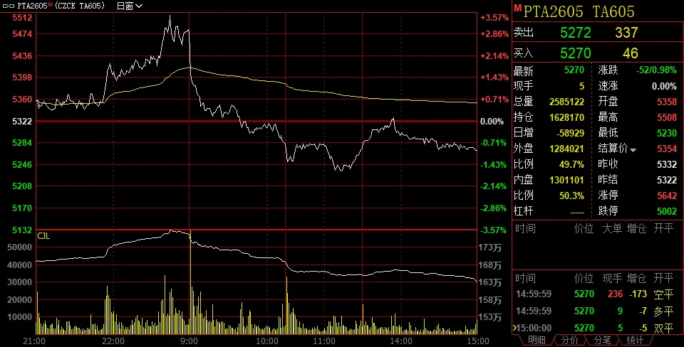 夜盘国际油价升至新高,再度点燃本已强势的化工期货,聚酯链积极跟涨,但盘初商品普遍跳水,收盘PTA下滑0.98%。本周PTA供应端表现稳定,随着终端负荷的持续下降,聚酯检修企业增多,平衡表累库范围扩大。