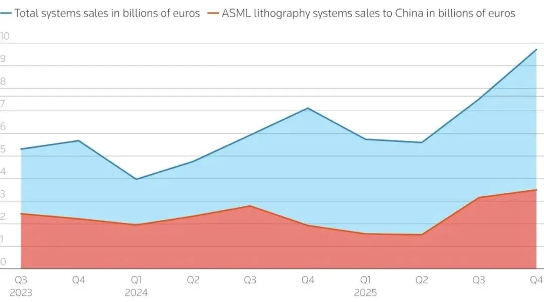 阿斯麦自2023年第三季度至2025年第四季度,各季度光刻系统总销售额与对华销售的对比变化趋势