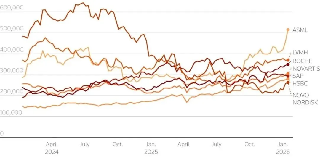 自2024年4月至2026年1月,阿斯麦与其他公司的市值比对趋势图
