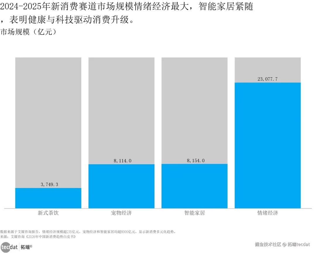 新消费赛道增长率对比图表1数据EXCEL及图表PDF模板已分享到会员群3秒解读:宠物经济成为新消费第一增长极,技术驱动型消费品增速亮眼,情绪消费需求凸显。对应人群行动建议:创业者可聚焦宠物经济细分场景(如宠物健康、智能用品);品牌运营者可加大新式茶饮的健康化、个性化研发投入。从市场规模维度,情绪经济以23077.7亿元的规模占据绝对主导,智能家居与宠物经济均突破8000亿元大关,分别达到8154亿元和8114亿元,新式茶饮市场规模也达到3749.3亿元。数据表明,健康管理、情感满足与科技赋能已成为新消费的核心驱动力,形成多元化的市场增长矩阵。