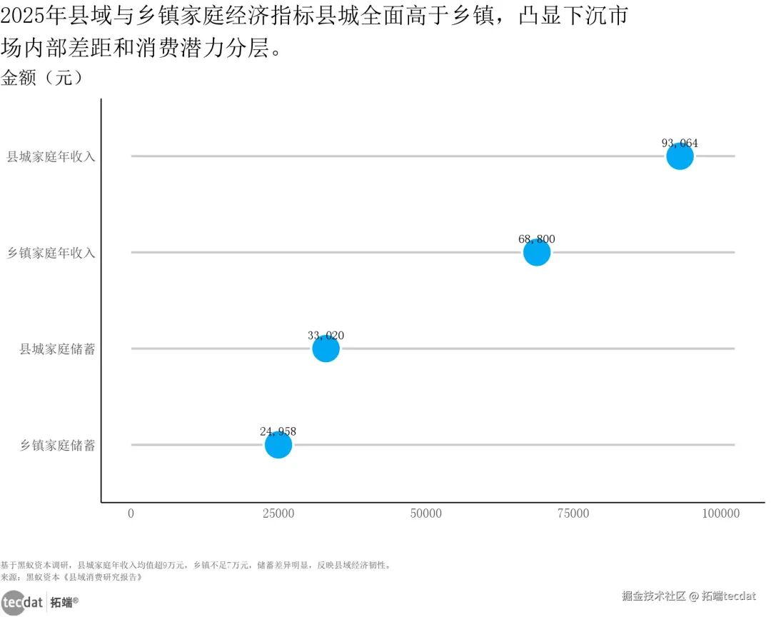 县域与乡镇市场的消费潜力持续释放,但内部差异显著。2025年县城家庭年收入均值达93064元,乡镇家庭为68800元,储蓄方面县城家庭33020元高于乡镇家庭24958元,这种经济实力的差距直接导致消费能力的分层,县域市场凭借更强的经济韧性成为下沉市场的核心引擎。