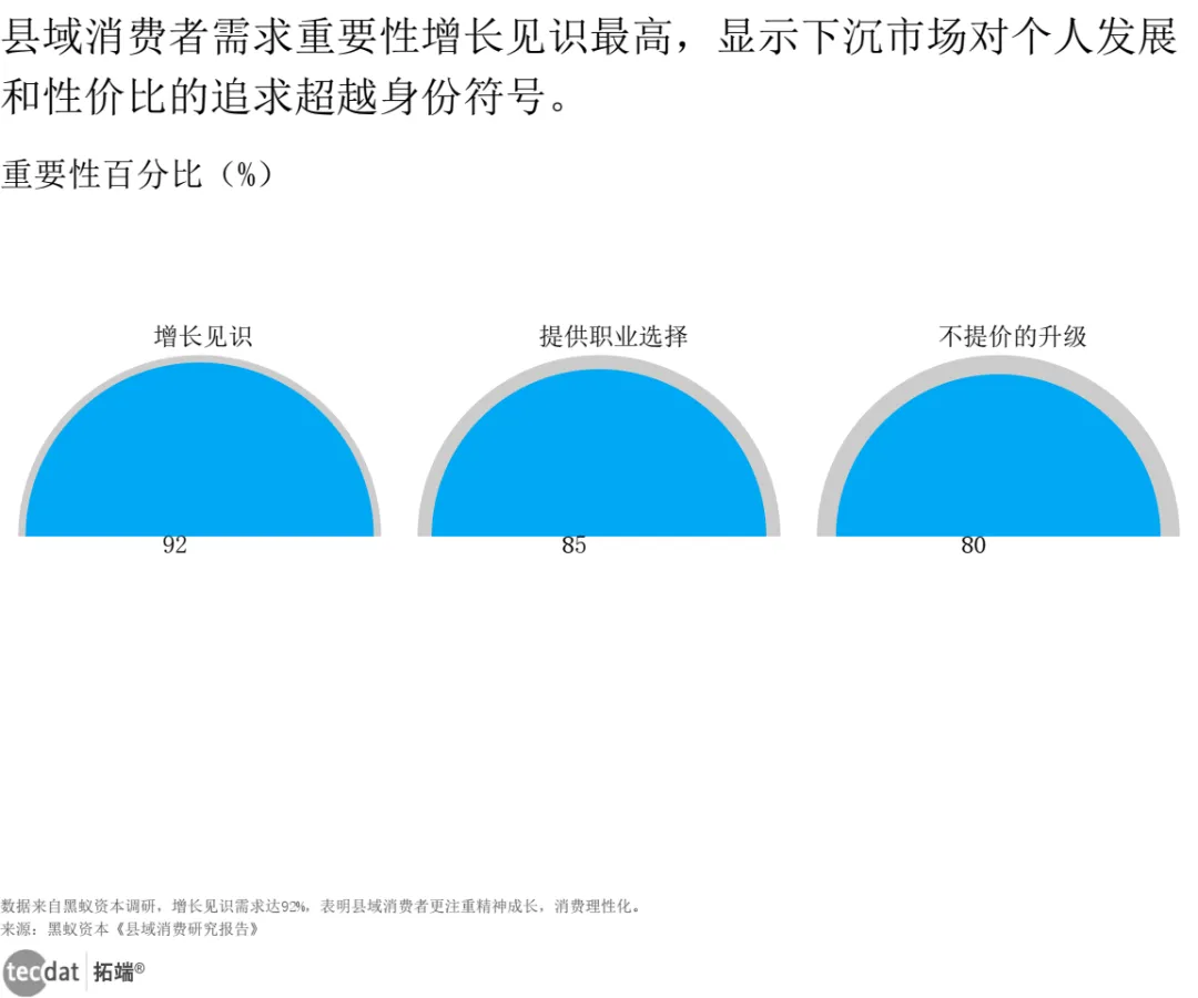 县域与乡镇家庭收入储蓄图表3数据EXCEL及图表PDF模板已分享到会员群3秒解读:县域家庭收入和储蓄均高于乡镇,下沉市场内部消费能力分层明显。对应人群行动建议:品牌运营者可针对县域市场推出中高端产品线,针对乡镇市场主打高性价比单品;线下门店老板可优先布局县域核心商圈,辐射乡镇市场。县域消费者的需求偏好呈现鲜明特征,“增长见识”以92%的重要性占比位居首位,“提供职业选择”和“不提价的升级”分别以85%和80%紧随其后。这表明下沉市场消费者不再单纯追求物质满足,而是更注重消费带来的长期价值与性价比,理性消费与自我提升需求并存。