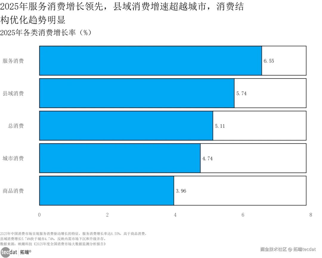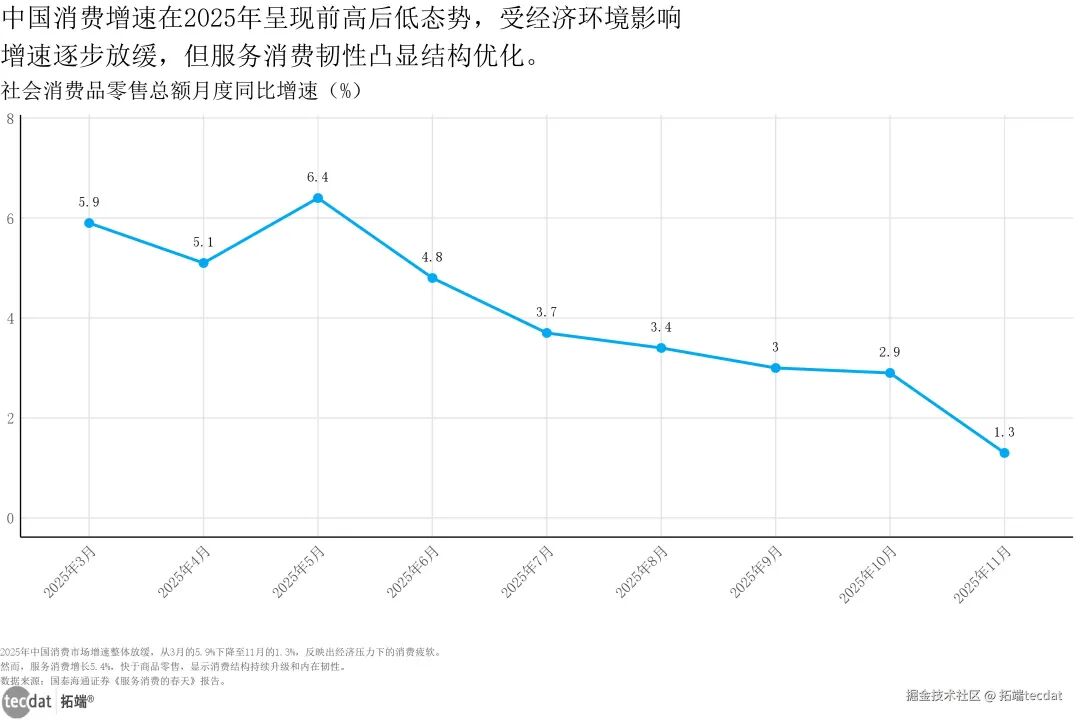 2025年中国消费市场增速呈现前高后低态势,社会消费品零售总额月度同比增速从3月的5.9%逐步回落至11月的1.3%,反映出经济环境对消费市场的阶段性影响。但从结构来看,服务消费增长5.4%,显著快于商品零售增速,这种结构性差异凸显了消费市场的内在韧性,消费升级的长期趋势并未改变。