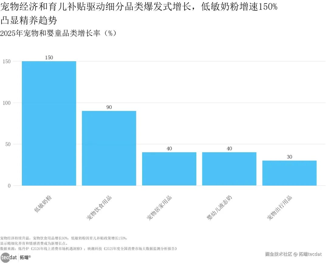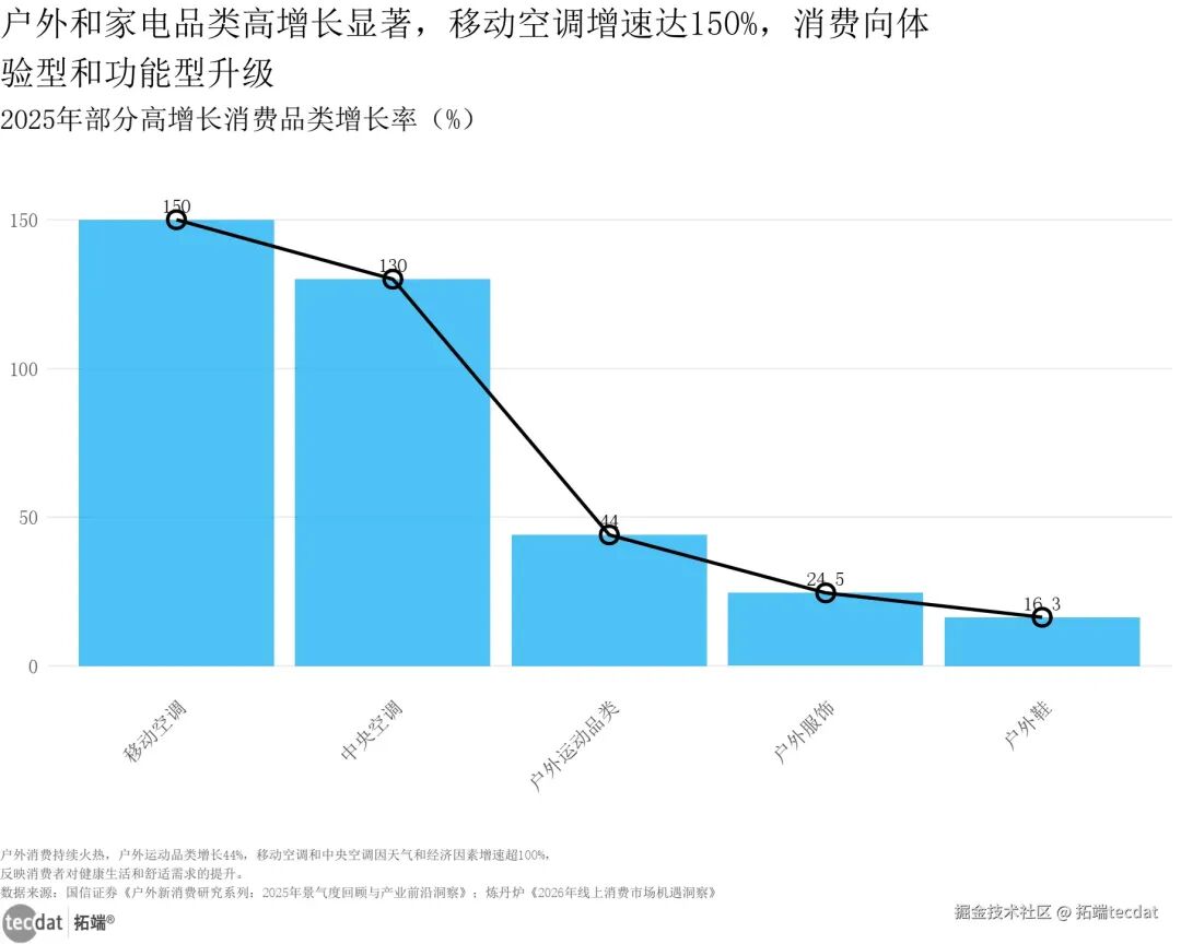 户外消费品类增长率图表7数据EXCEL及图表PDF模板已分享到会员群3秒解读:户外消费全品类高增,服饰和鞋类是核心增量,健康生活方式驱动需求爆发。对应人群行动建议:线下门店老板可增设户外装备专区,引入小众户外品牌;创业者可开发户外场景配套服务(如露营地运营、户外技能培训)。家电品类中,移动空调与中央空调增速尤为突出,分别达到150%和130%,受天气因素与居住品质升级需求驱动,功能型家电成为消费热点。宠物经济与婴童消费的精细化趋势显著,宠物饮食用品增长率高达90%,宠物居家用品(40%)、出行用品(30%)同步增长,反映出“宠物拟人化”趋势下的精养需求;婴童品类中,低敏奶粉因育儿补贴政策与健康需求,增速达150%,婴幼儿液态奶40%的增长也印证了育儿消费的升级趋势。