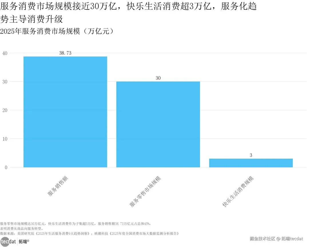 服务消费已成为消费升级的核心引擎,市场规模持续扩大。2025年服务零售市场规模达30万亿元,快乐生活消费超3万亿元,服务销售额38.73万亿元占总体消费的45%,标志着中国消费正式迈入“服务主导”时代。消费结构从商品向服务的转型,本质是消费者从物质满足向体验追求的需求升级。