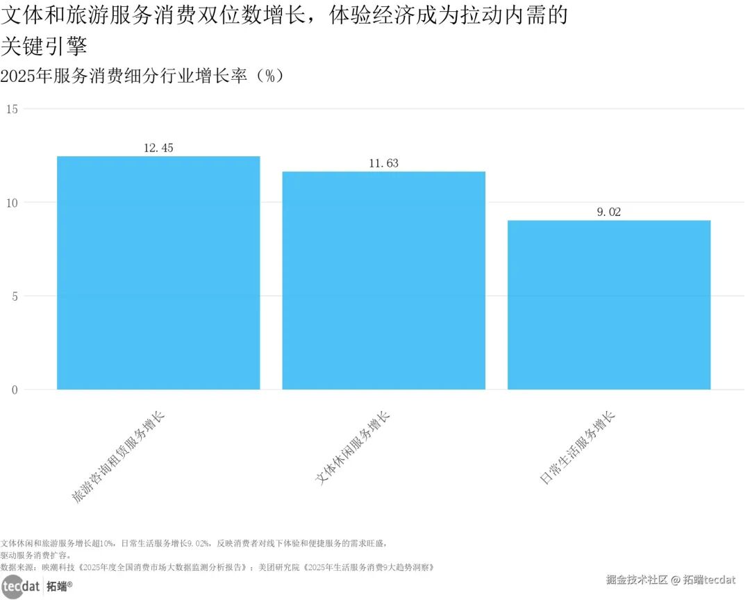 服务消费市场规模图表9数据EXCEL及图表PDF模板已分享到会员群3秒解读:服务消费占总体消费近半,快乐生活消费成重要增长点,服务主导型消费格局成型。对应人群行动建议:创业者可聚焦快乐生活相关服务(如情绪疗愈、兴趣社群);服务行业从业者可提升服务标准化与个性化水平,增强用户粘性。细分行业中,旅游咨询租赁服务以12.45%的增长率领跑,文体休闲服务增长11.63%,日常生活服务增长9.02%。线下体验与便捷服务需求的旺盛,推动服务消费向多元化、品质化方向发展,文体休闲与旅游服务的双位数增长,更是体验经济崛起的直接体现,成为拉动内需的关键力量。
