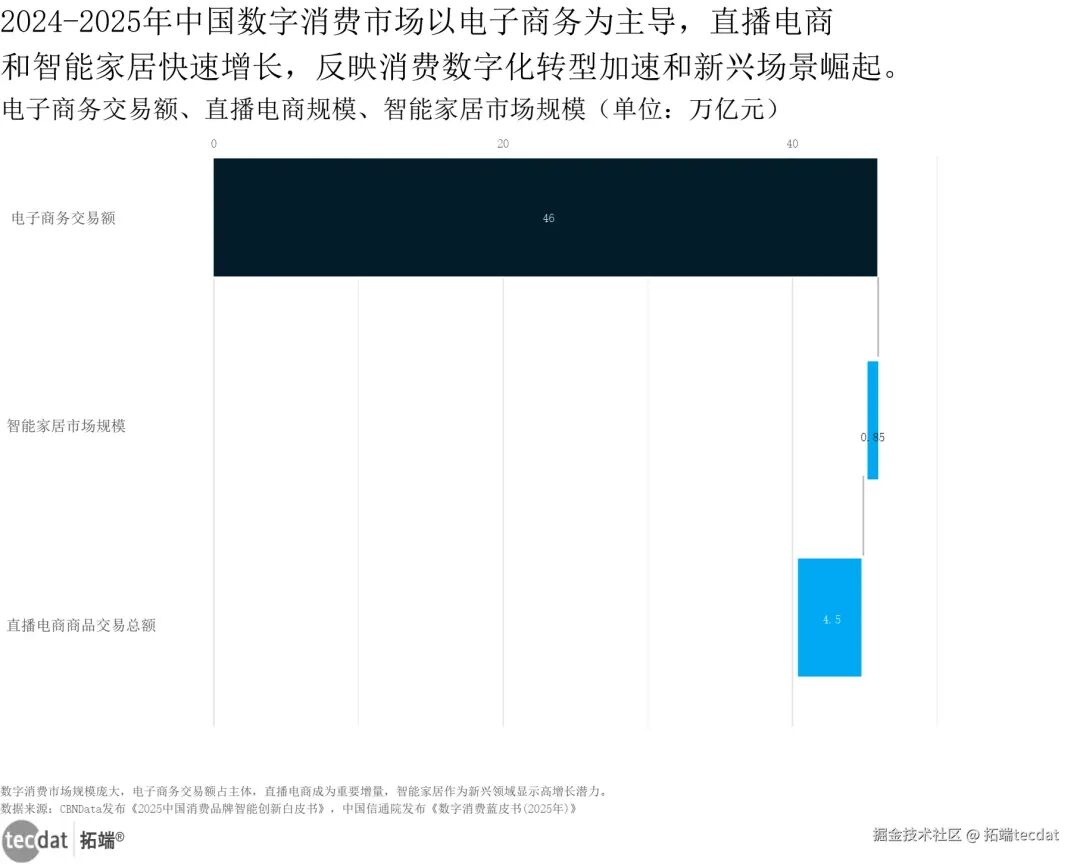数字消费市场呈现“主体庞大、增量突出”的特征。2024年电子商务交易额达46万亿元,作为核心增量的直播电商商品交易总额突破4.5万亿元,智能家居市场规模达0.85万亿元。数字技术与消费场景的深度融合,推动消费渠道与产品形态的双重革新,直播电商的爆发式增长印证了“内容+消费”模式的巨大潜力。