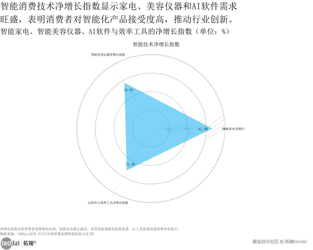 数字消费核心规模图表11数据EXCEL及图表PDF模板已分享到会员群3秒解读:电子商务交易额达46万亿,直播电商成核心增量,智能家居市场规模超8000亿。对应人群行动建议:品牌运营者可布局直播电商内容矩阵,打造专属IP;创业者可开发智能家居联动场景解决方案,接入直播电商渠道。智能技术的消费渗透率持续提升,智能家电净增长指数41.2%位居首位,智能美容仪器35.6%、AI软件与效率工具32.4%紧随其后。净增长指数反映出消费者对智能化产品的预算投入持续增加,家庭智能化、个人护理智能化与效率提升类工具成为三大核心场景,推动消费向高效、便捷、个性化方向发展。