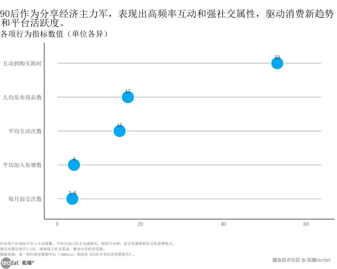 90后作为消费市场的核心力量,展现出鲜明的分享经济特征。该群体在闲置交易平台上平均互动次数达15次,人均累计发布商品17件,从互动到购买平均耗时53分钟,每月当面交易次数3.6次,平均加入4个兴趣社群(鱼塘)。高频率互动、强社交属性与线下交易偏好,使得90后成为分享经济的主力军,其消费行为不仅追求物质价值,更注重社交连接与体验感,正在重塑消费市场的运行逻辑。