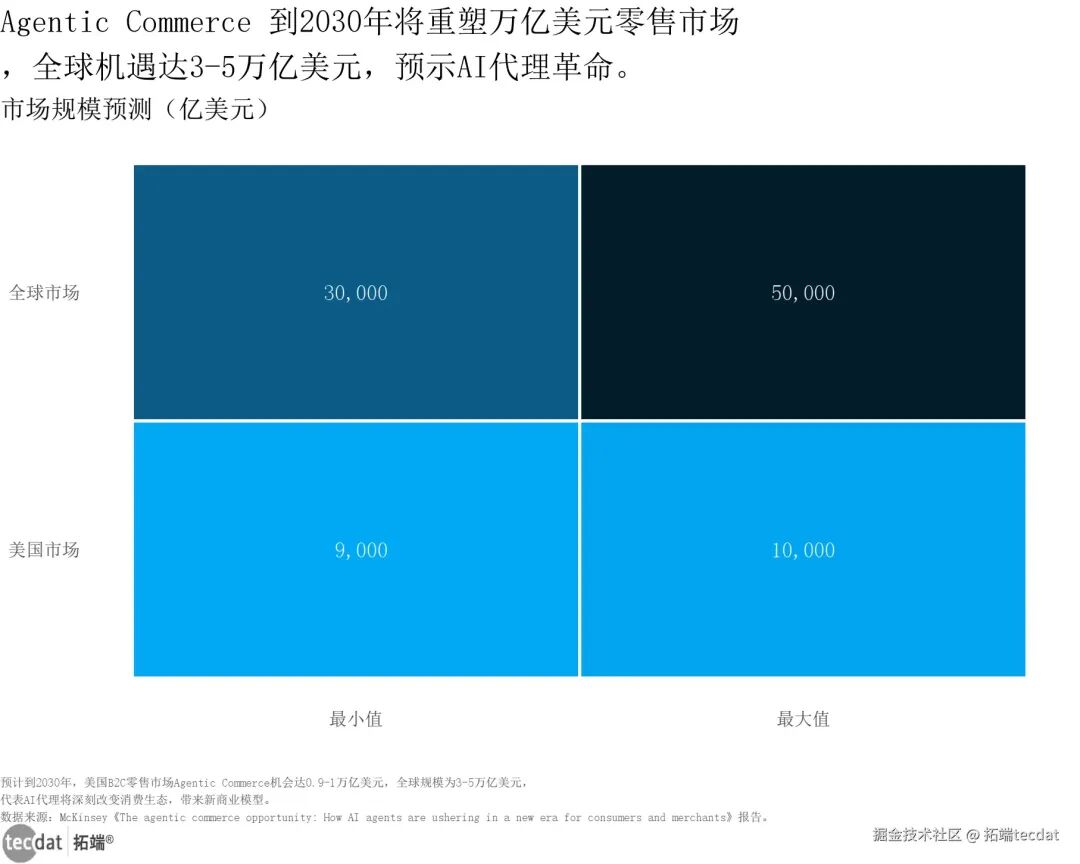 90后消费行为指标阴影条形图表15数据EXCEL及图表PDF模板已分享到会员群3秒解读:90后分享经济互动频繁,面交偏好明显,社交属性主导消费决策。对应人群行动建议:线下门店老板可打造主题打卡场景,鼓励用户互动分享;品牌运营者可推出圈层化产品,比如IP联名款,强化身份认同。年轻群体对新消费形态的接受度领先,Agentic Commerce(智能代理消费)作为新兴模式,正逐步进入大众视野。预测2030年Agentic Commerce全球市场规模达3-5万亿美元,美国B2C零售机会0.9-1万亿美元,90后作为数字原住民,将率先拥抱这一模式,推动消费向更智能、更个性化方向发展。