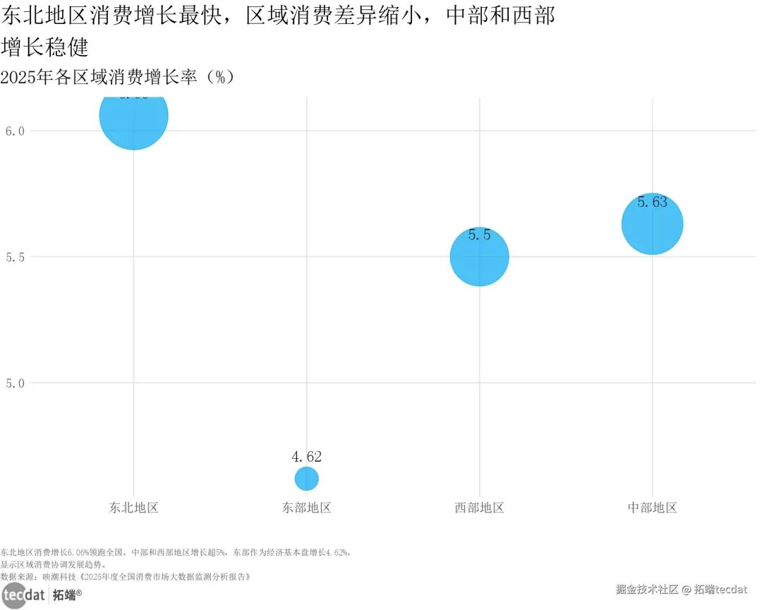 县域消费者需求偏好图表4数据EXCEL及图表PDF模板已分享到会员群3秒解读:下沉市场消费者最看重“增长见识”,性价比与职业相关消费需求突出。对应人群行动建议:文旅从业者可开发县域周边研学旅游产品;品牌运营者可推出“平价升级”款产品,附加职业技能相关服务(如美妆培训、创业指导)。从全国区域消费增长来看,2025年服务消费增长率6.55%显著高于商品消费3.96%,县域消费增长5.74%超越城市消费4.74%,区域层面东北地区以6.06%的增速领跑,中部(5.63%)、西部(5.50%)增速稳健,东部地区4.62%的增长彰显经济基本盘的稳定性。这种格局反映出消费市场“下沉升级”与“区域协调”的双重趋势。