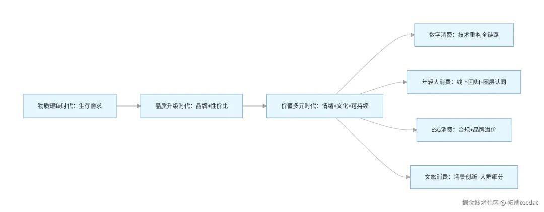 从数字消费的技术赋能到年轻人线下消费的情绪驱动,从ESG的政策合规到文旅消费的场景创新,消费行业的边界不断拓展。早期物资短缺时代,消费核心是满足基本生存;随着收入提升,转向品质与性价比;如今数字技术与年轻群体崛起,消费进入“价值多元”阶段,情绪价值、文化认同、可持续发展成为新决策维度。这一演进是居民收入增长、数字基建完善、社会观念升级共同作用的结果,也让消费行业从“产品为王”转向“用户价值为王”。本报告将梳理行业演进脉络,拆解核心趋势下的机会点,为不同类型从业者提供可落地的行动参考。