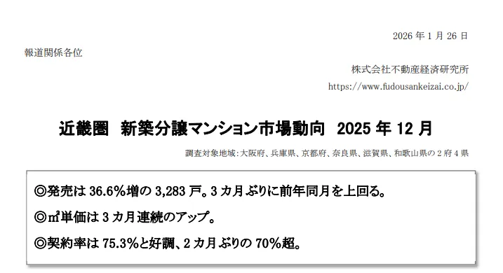 全年总结: 2025 年近畿地区全年总供应量达到 16,922 户,同比增加 11.8%。值得关注的是,“亿日元豪宅”(1 亿日元以上单位)全年成交达 972 户,同比增长 20.1%,创 2000 年以来新高。