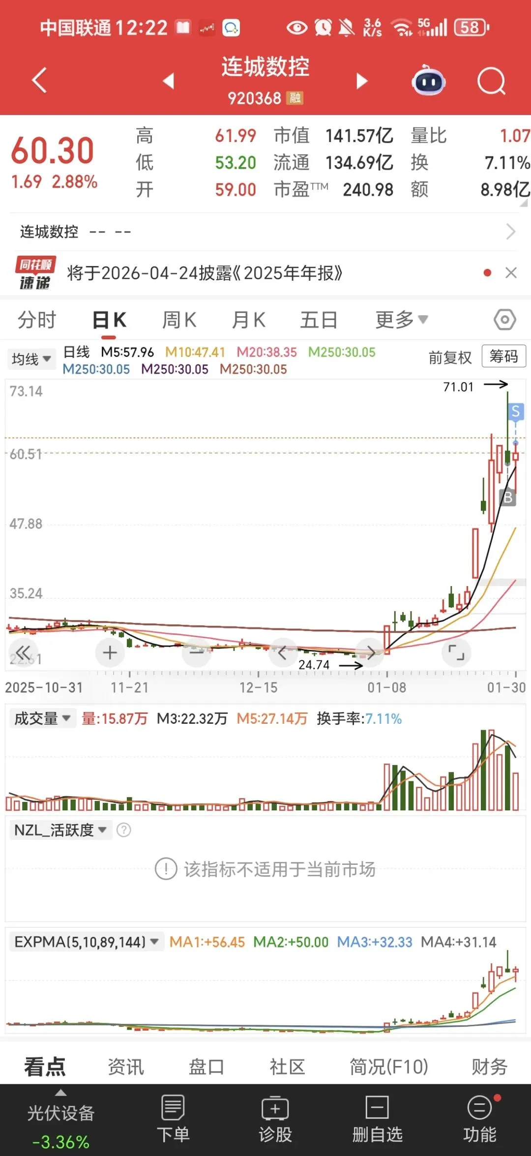 对我而言,卖出连城数控不是否定它的长期价值,而是顺应当下的市场节奏。投资从来不是死扛硬守,而是懂得审时度势,在行情好的时候积极进攻,在行情差的时候果断防守。空仓从来都不是不作为,而是退潮期里最主动的风控策略,是专业交易者和业余散户的核心区别之一。空仓能让我避开系统性下跌的风险,保住前期积累的利润,更能让我保持清醒的头脑,不被市场的恐慌情绪裹挟,不用在每日的涨跌中焦虑纠结。