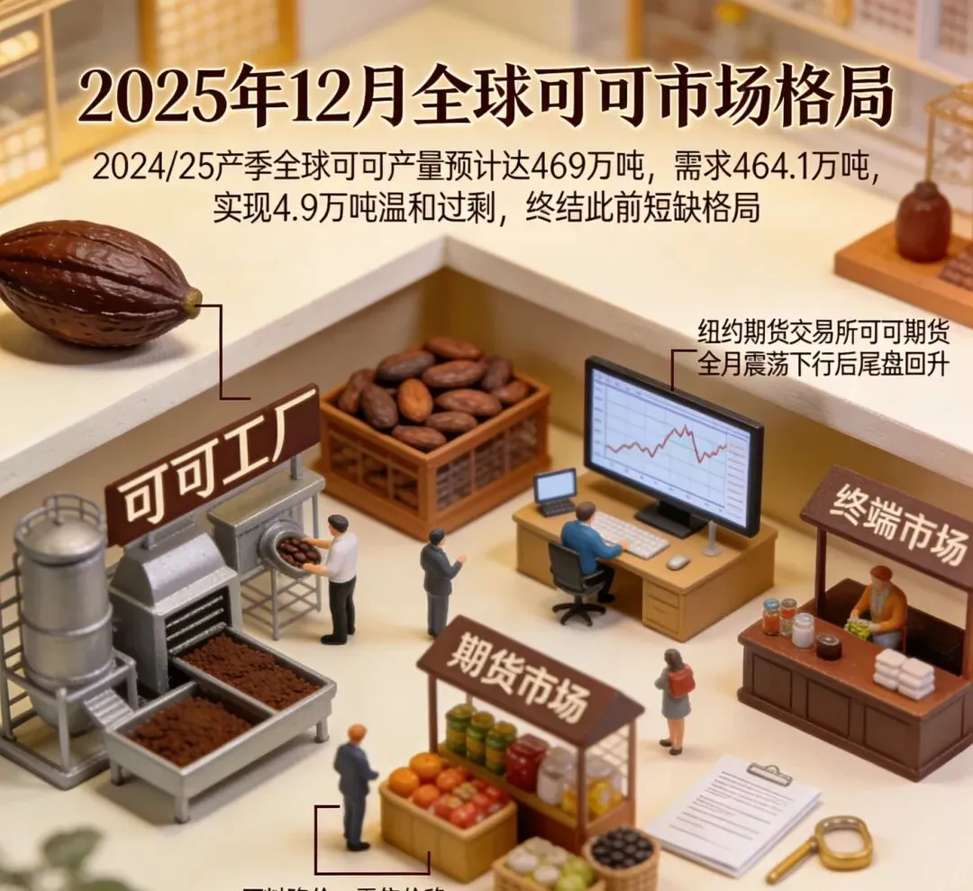 2025年12月全球可可市场呈现供需格局逆转、期货价格震荡回落、产业升级加速的核心特征。国际可可组织(ICCO)数据显示,2024/25产季全球可可产量预计达469万吨,需求464.1万吨,实现4.9万吨温和过剩,终结此前短缺格局。纽约期货交易所可可期货全月震荡下行后尾盘回升,终端市场则维持"原料降价、零售价稳"态势,叠加中欧美政策调整与产业创新,市场正从高位动荡逐步向稳健运行过渡。