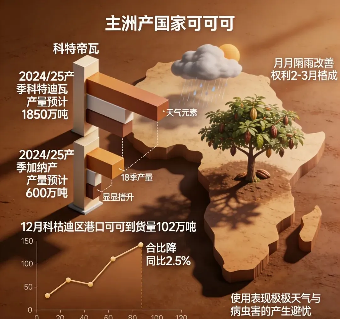 1. 非洲主产国温和恢复:科特迪瓦、加纳合计占全球产量60%,2024/25产季两国产量预计分别达1850万吨、600万吨,较上季显著回升。12月科特迪瓦港口可可到货量达102万吨,虽同比降2.5%,但月末降雨改善,利好2-3月收成。不过极端天气与病虫害仍为产能隐忧,未完全消除供应波动风险。
