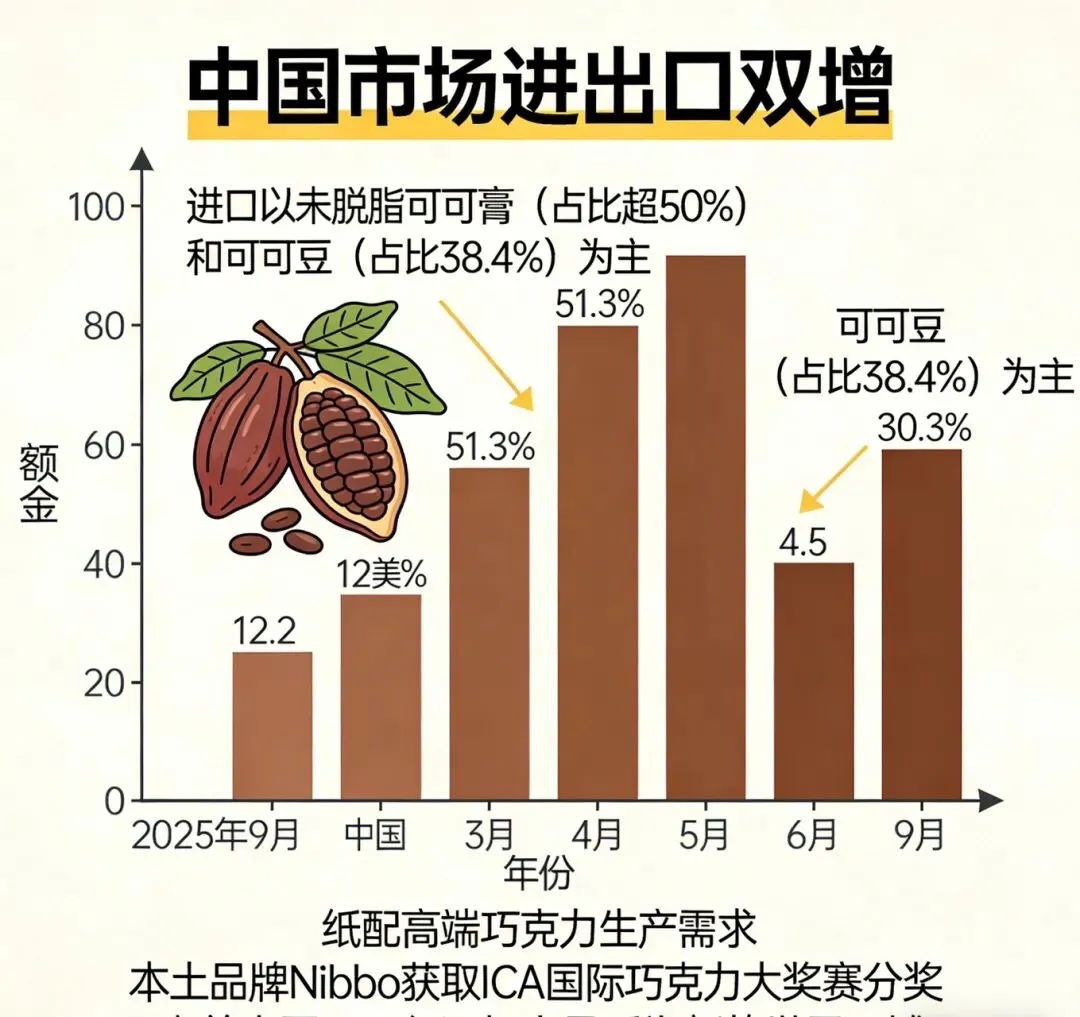 2. 中国市场进出口双增:2025年前9月中国可可及其制品进口额12.2亿美元同比增51.3%,出口额4.5亿美元同比增30.3%,进口以未脱脂可可膏(占比超50%)和可可豆(占比38.4%)为主,适配高端巧克力生产需求。本土品牌Nibbo斩获ICA国际巧克力大奖赛金奖,标志着中国可可深加工品质跻身世界一流。