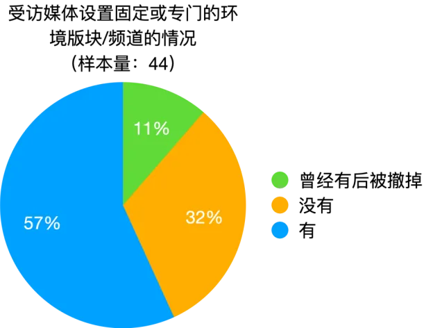受访媒体中,有25家媒体日常设有固定环境报道版面或栏目、节目(以下简称“环境版面”),占比高达57%;有5家曾经开辟过环境版面,占比11%;还有14家未开辟环境版面,占比32%。