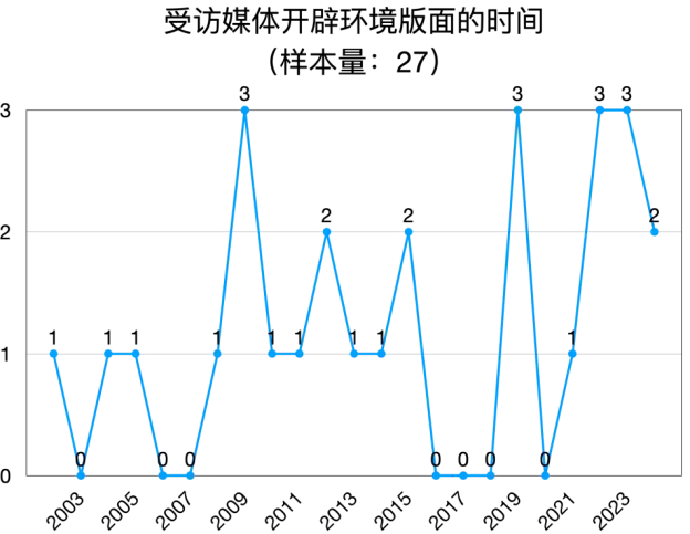 从时间段看,受访媒体中开设环境版面的时间集中在2009年前后、2019-2023年。前者关联哥本哈根气候谈判、雾霾突袭等,后者与打赢污染防治攻坚战、提出“双碳”目标等有关。