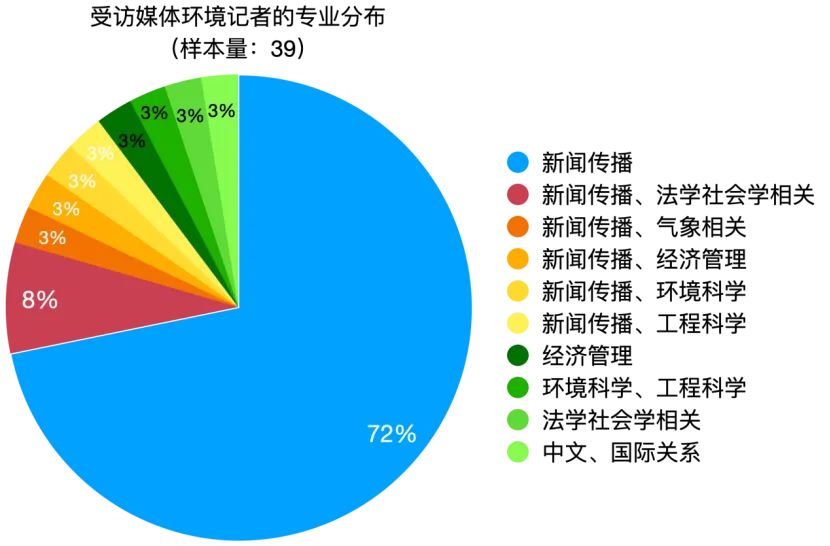 专业角度,28家媒体的环境记者最终专业只有新闻传播,占比72%;7家媒体的环境记者最终专业既包括新闻传播专业,也包括法学社会学相关、气象相关、工程科学、环境科学、经济管理,占比20%;4家媒体的环境记者最终专业没有新闻传播,主要是经济管理、环境科学、工程科学,占比12%(注:统计数据四舍五入后可能导致总占比不等于100%的情况)。
