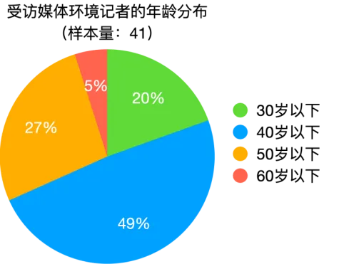 受访媒体中,8家媒体环境记者年龄集中在30岁以下,占比20%;20家媒体环境记者年龄集中在40岁以下,占比49%;11家媒体环境记者年龄集中在50岁以下,占比27%;还有2家媒体环境记者的年龄分布较高,最高到60岁,占比5%。