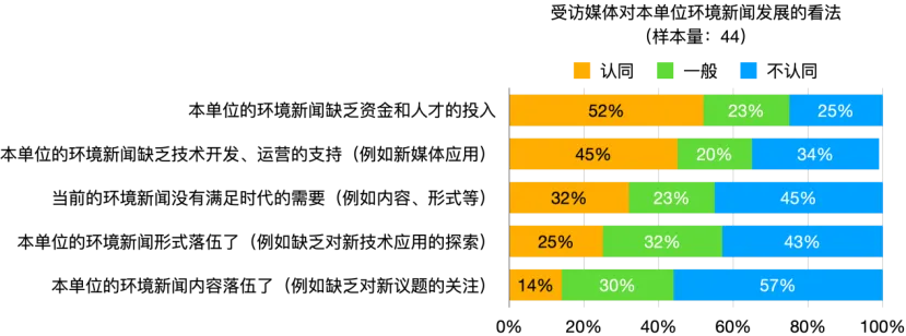 52%的受访媒体表示认同“本单位的环境新闻缺乏资金和人才的投入”,45%的受访媒体表示认同“本单位的环境新闻缺乏技术开发、运营的支持”,均高于“不认同”的比例。