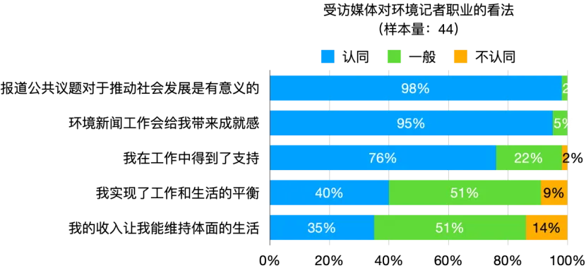 一方面,98%的受访媒体表示“报道公共议题对于推动社会发展是有意义的”,95%的受访媒体表示“环境新闻工作会给我带来成就感”,76%的受访媒体表示“在工作中得到了支持”。