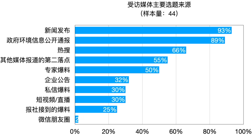 93%的受访媒体环境新闻选题主要来源是“新闻发布”,有89%的受访媒体主要选题来源是“政府环境信息公开通报”,有66%的受访媒体主要选题来源是“热搜”,有55%的受访媒体主要选题来源是“其他媒体报道的第二落点”。