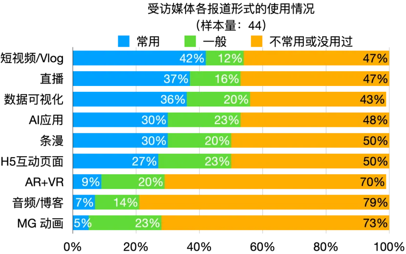 除文字报道外,短视频/Vlog、直播和数据可视化常被受访媒体使用,常用的受访媒体占比分别为42%、37%和36%。