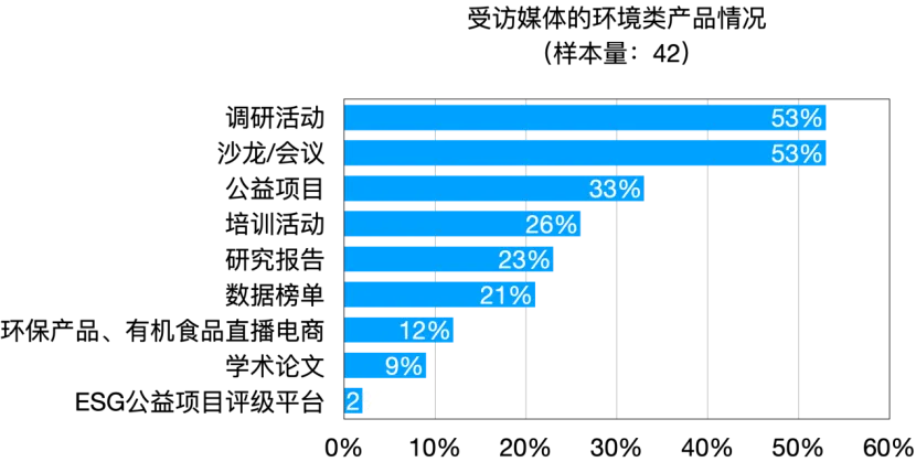 受访媒体中95%拥有环境类产品。在各种环境类产品中,53%的受访媒体曾开展调研活动,53%的受访媒体曾主办沙龙/会议,33%的受访媒体曾设置公益项目。还有受访媒体曾举办培训活动、发布研究报告、发表学术论文、搭建ESG公益项目评级平台、开展直播等。