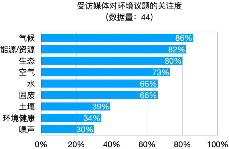 具体而言,气候、能源/资源、生态三大议题媒体关注度最高。有86%的受访媒体关注气候议题,82%的受访媒体关注能源/资源议题,80%的受访媒体关注生态议题。