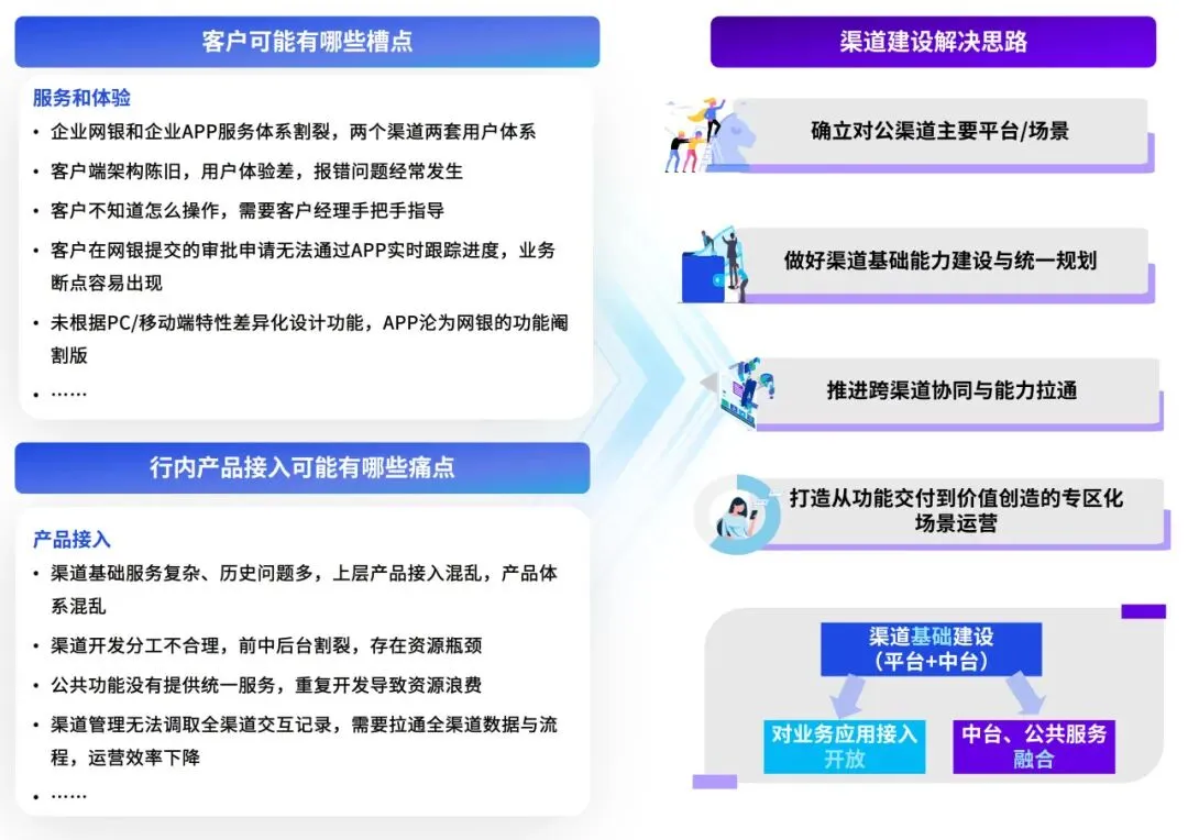 渠道碎片化是银行对公服务的核心痛点。不同终端界面割裂、操作逻辑矛盾、数据无法互通,导致企业财务人员需反复切换系统完成基础操作。中小银行可以学习领先银行整合线上官网、移动端、线下网点、合作生态等渠道的经验,做好三层基础能力建设以统一服务企业对公业务全场景。