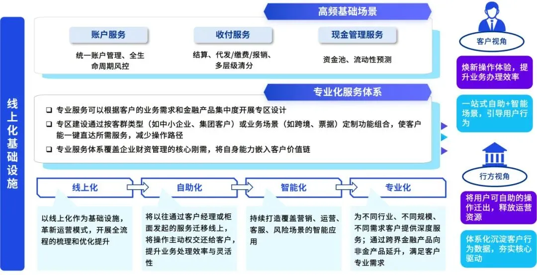 领先银行以账户服务、收付服务、现金管理服务、跨境服务、票据服务、融资服务、理财服务等重要财资场景为核心载体,通过精细化运营满足企业客户各类业务需求。将高频场景作为企业客户经营的切入点,平台承载企业日常经营中最为核心、最为高频的行为,以此降低数字化门槛、提升粘性,并为拓展低频高价值服务奠定入口基础。同时高频行为使用本身,可以深入解决具体业务痛点并建立银企长期合作关系。