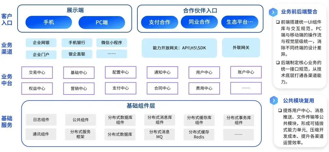 公共模块复用:提炼用户中心、消息推送、文件传输等公共模块,形成可插拔式能力单元,例如在基础服务层,通过统一文件服务支持网银与线下柜台共享同一套电子回单模板,压缩开发成本、提升各渠道运营效率。