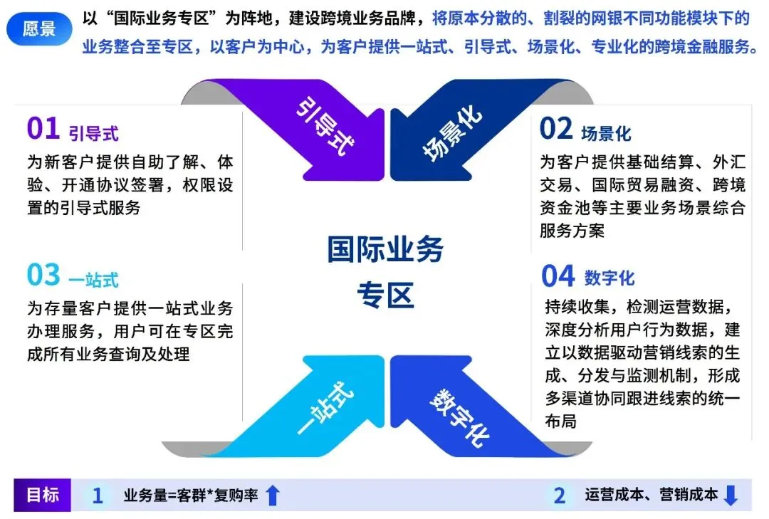 根据专区建设需要将场景化功能封装:领先银行将原本分散的、割裂的网银不同功能模块下的业务整合至“跨境采购一站式”专区,以客户为中心,为客户提供一站式、引导式、场景化、专业化的跨境金融服务。