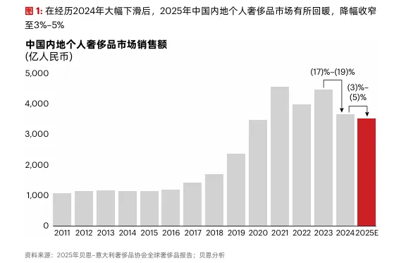 贝恩公司最新发布的《2025年中国个人奢侈品报告》显示,2025年中国内地个人奢侈品市场呈现出 “降幅收窄、逐步回暖” 的态势,全年市场规模较上年收缩3%至5%,相较于2024年的大幅下滑,态势明显缓和。尽管这一年消费者信心整体较为谨慎,但自第三季度起,市场已浮现复苏的初步迹象。