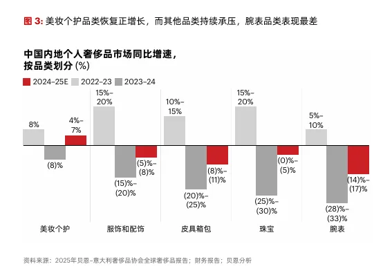 不同奢侈品类在2025年的市场表现呈现明显分化: