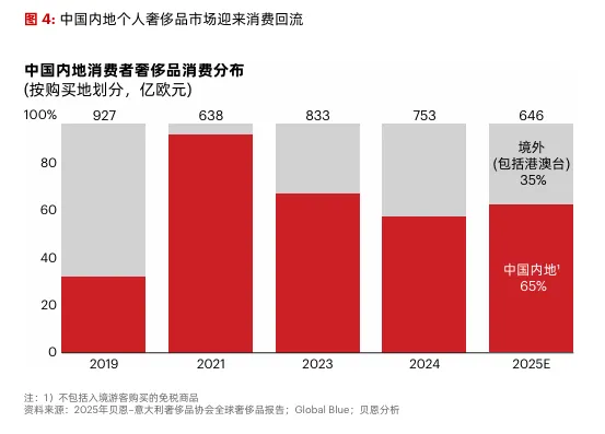 与2023年、2024年相比,2025年中国消费者海外奢侈品消费份额显著回落。数据显示,全年中国奢侈品消费中65%发生在中国内地,35%发生在境外,消费回流趋势进一步强化。