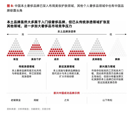 报告同时关注到中国本土奢侈品品牌的持续崛起,尤其是在美妆护肤和部分个人奢侈品品类中。这些本土品牌通过文化相关的产品设计、数字化和互动导向的消费者策略以及由本地投入和供应链支持的竞争性价格定位获得市场份额。