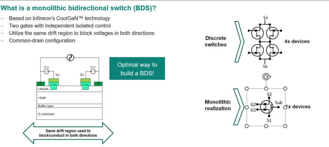 英飞凌推出的CoolGaN™双向开关(BDS)技术,彻底改变了这一局面。这是一种单片集成的解决方案,它利用GaN独特的横向结构优势,在单颗芯片上实现了双向耐压和双向导通。
