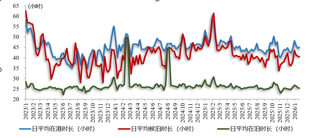 【集运市场概况】需求端,2025年12月份全球制造业PMI指数为49.5%,环比微降0.1个百分点,已连续10个月位于荣枯线50%以下。12月全球制造业维持稳中偏弱的弱势复苏格局。供给端,美西、地中海、日韩及东南亚航线运力上升,美东及欧线回落,全球闲散运力有所下降。【供应链扰动事件】2026年1月下旬,美国东海岸及南部遭遇强寒潮与暴雪,多地港口被迫限制或暂停船舶靠泊与装卸作业,港内交通与铁路接驳效率下降,陆路集疏运受阻。此次天气导致船期延误,并加剧箱源和场地周转压力。目前多数港口虽逐步恢复,但积压货量仍将持续影响后续作业效率。【在港船舶数量分析】根据图表1可见,本期全球主要集装箱港口日均在港/候泊/在泊的船舶数量分别为1852/439 /1464 艘,分别较上期环比增速-2.4%/-5.1% /-0.5%,日均在港/候泊船舶数量呈现小幅下降趋势。【在港船舶时间效率分析】根据图表2可见,本期全球主要集装箱港口平均在港/候泊/在泊时间分别为44.4 /40.0/25.2小时,分别较上期环比增速-7.2%/-8.7% /-5.8%,船舶平均在港、侯泊、在泊时间均为下降趋势。