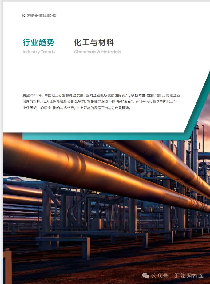 2025年,中国化工行业将呈现四大发展趋势。首先,全球资产版图将重塑,中国企业有望在符合各方期待与利益的情况下,抓住优质资产机会,通过跨境并购等方式,提升国际竞争力。其次,国产替代将方兴未艾,随着下游高端制造产业的发展,中下游材料依赖进口的问题将得到进一步解决,化工产业将进入新一轮国产替代阶段。此外,治理管控将提质再造,企业将通过管理重构,提升竞争力,实现战略发展与业务经营的双重目标。最后,人工智能将宏图渐展,AI技术将在化工行业的研发、生产、销售等环节得到更广泛的应用,推动行业向智能化、数字化方向发展。