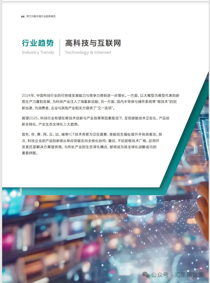 2025年,中国科技行业将在根技术创新与产业政策等因素驱动下,呈现使能技术泛在化、产品创新全栈化、产业生态全球化三大趋势。首先,ICT技术将更为泛在普惠,提升民生福祉和良政善治。其次,科技企业的产品创新将从单点突破走向全栈化协同,推动产业生态的全球化发展。此外,中国科技企业出海进程将加速,通过生产、研发等基地的建设,深度融入在地国家的发展。在数据要素市场方面,随着AI技术的加速普及,企业对高质量多模态数据集的需求将迎来爆发式增长,数据要素市场将发挥越来越重要的作用。最后,生成式AI将与垂直行业深度融合,聚焦行业价值创造,推动医疗、教育、金融等行业的智能化转型。