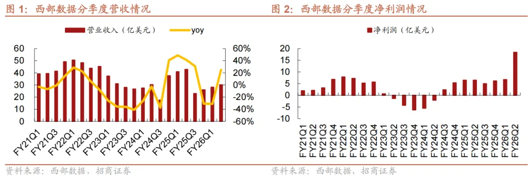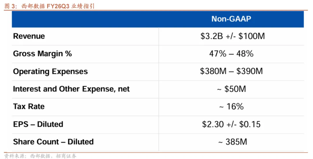 FY26Q2营收30.17亿美元,同比+25%/环比+7%,超指引上限(28-30亿美元),主要系市场对nearline硬盘需求强劲拉动;毛利率为46.1%,同比+7.7pcts/环比+2.2pcts,超出此前指引上限(44%-45%),毛利率改善主要系持续向高容量硬盘迁移与制造工厂及整个供应链中的严格成本控制。EPS为2.13美元,超出指引上限(1.73-2.03美元)。
