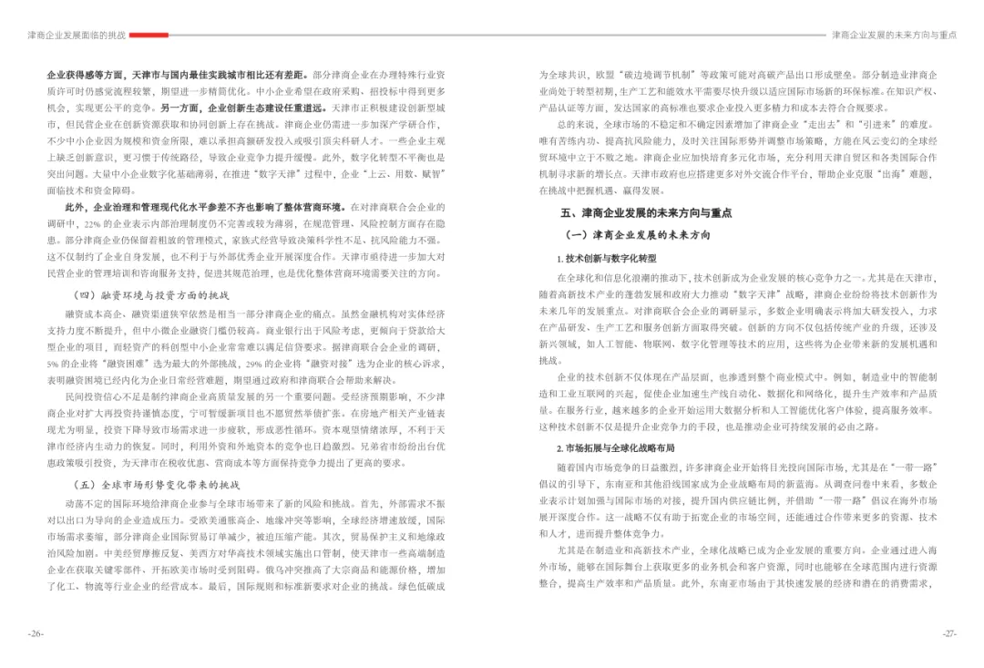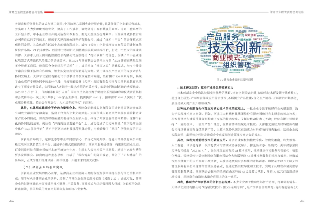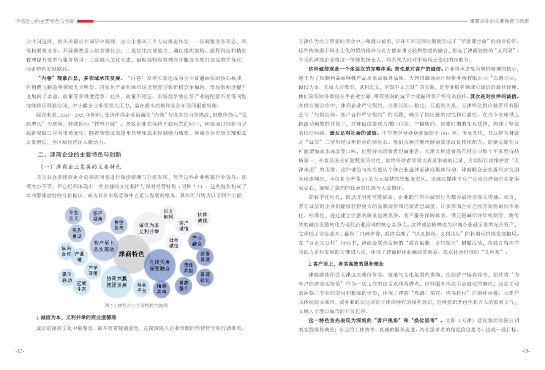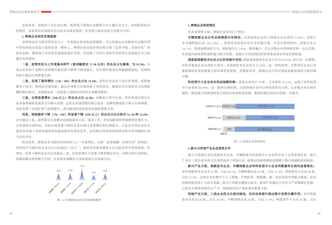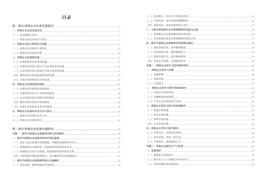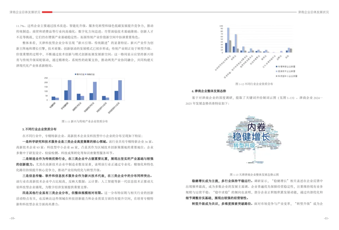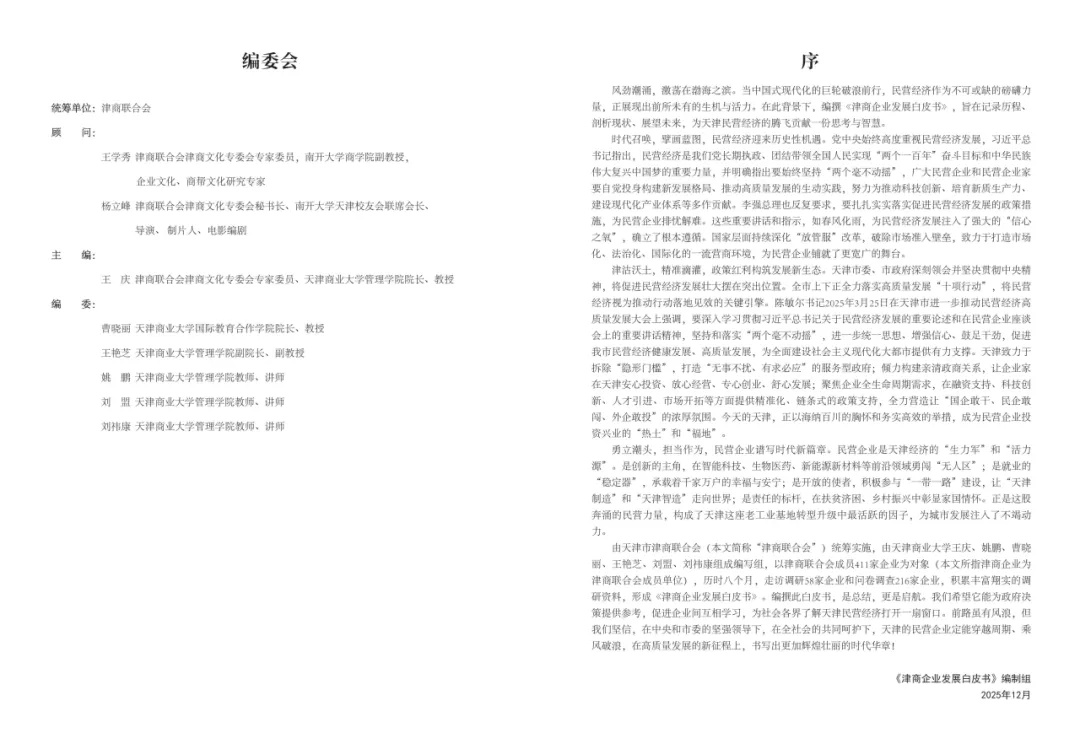 《津商企业发展白皮书》是反映天津市民营经济最新动态和发展前沿的权威报告,围绕天津民营企业及企业家的发展亮点、现实困境与成长模式进行专题研究,重点聚焦于新质生产力发展、天津民营企业家精神培育、企业核心竞争力提升等关键方向,力求内容兼具全面性与专业性。全面呈现了津商企业在新旧动能转换中的现实基础与发展潜力,既看到传统产业稳中有进,也看到新兴产业加速成长。面对市场内卷、成本上升等挑战,津商企业正以创新驱动、数字化转型和绿色发展为主线,主动融入国家战略和区域协同发展大局。希望广大津商坚定信心、守正创新,凝聚合力、勇担使命,共同书写津商高质量发展的新篇章。