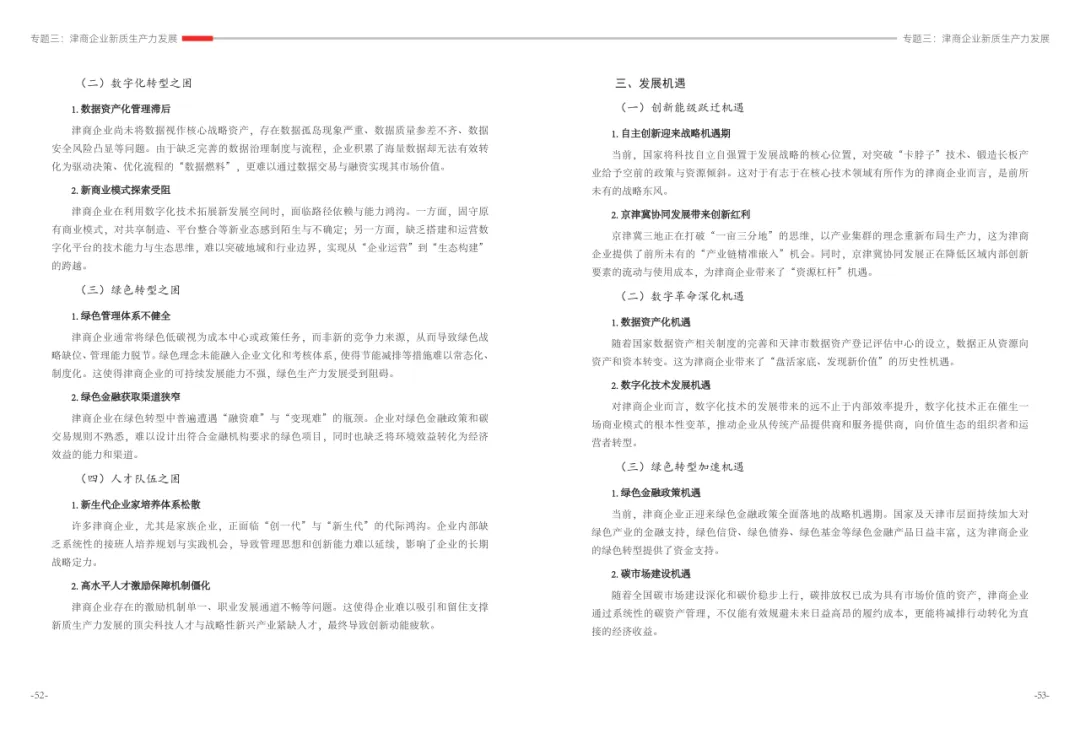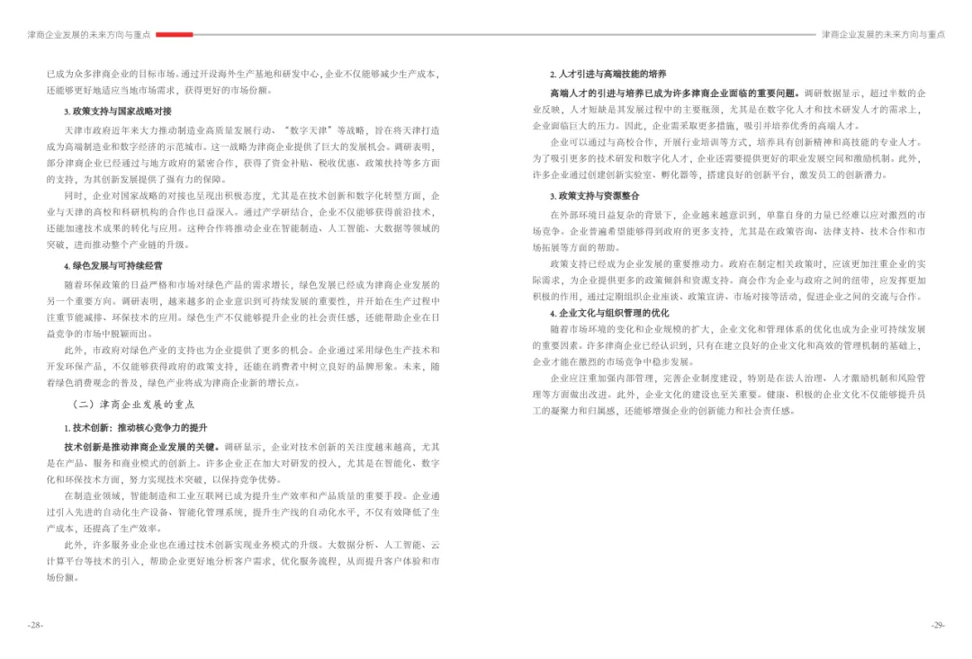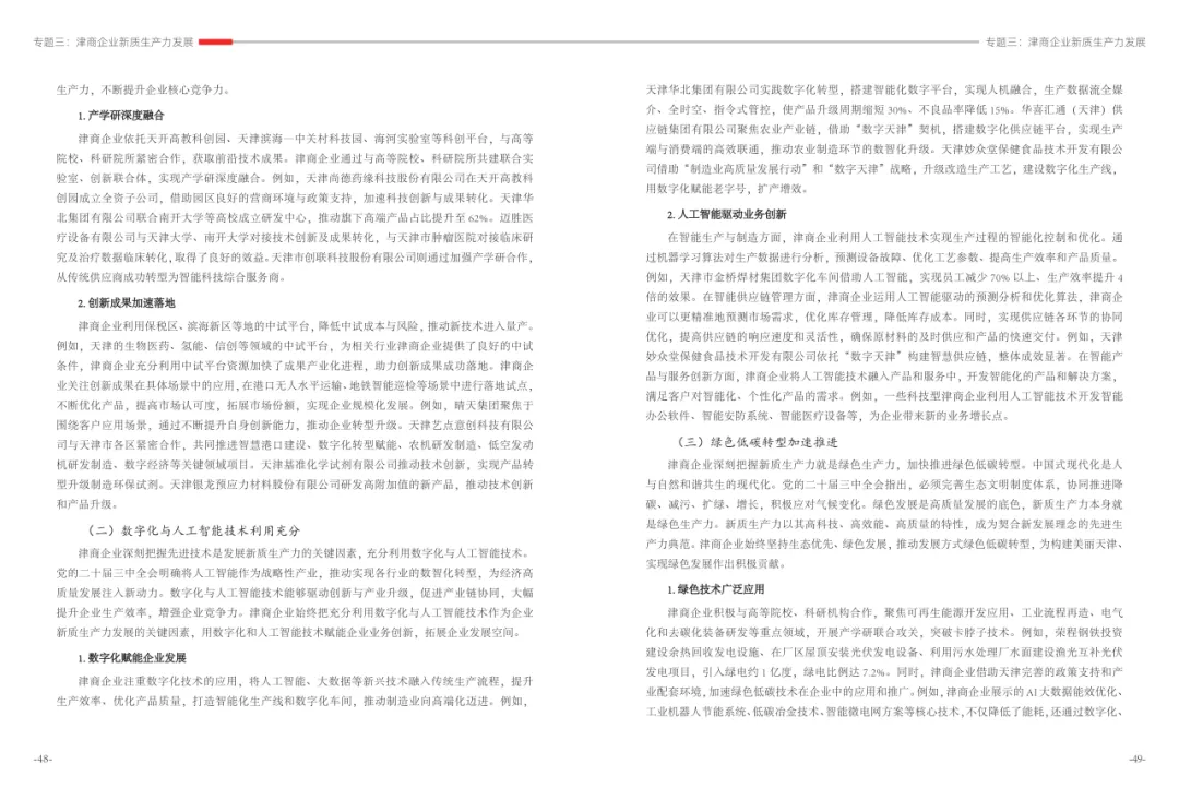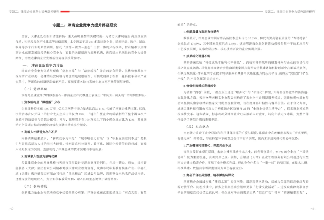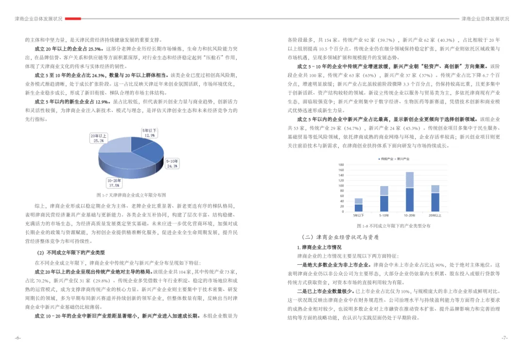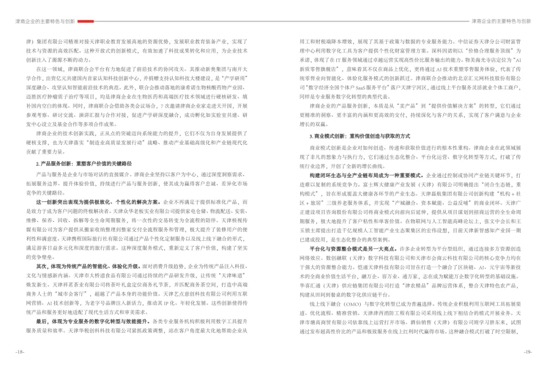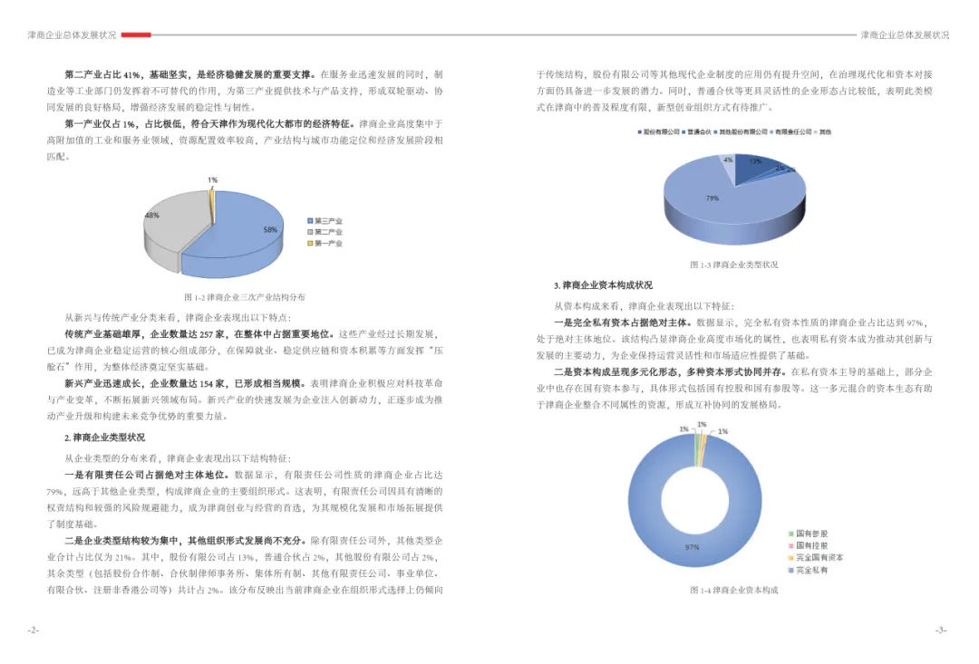 《津商企业发展白皮书》是反映天津市民营经济最新动态和发展前沿的权威报告,围绕天津民营企业及企业家的发展亮点、现实困境与成长模式进行专题研究,重点聚焦于新质生产力发展、天津民营企业家精神培育、企业核心竞争力提升等关键方向,力求内容兼具全面性与专业性。全面呈现了津商企业在新旧动能转换中的现实基础与发展潜力,既看到传统产业稳中有进,也看到新兴产业加速成长。面对市场内卷、成本上升等挑战,津商企业正以创新驱动、数字化转型和绿色发展为主线,主动融入国家战略和区域协同发展大局。希望广大津商坚定信心、守正创新,凝聚合力、勇担使命,共同书写津商高质量发展的新篇章。